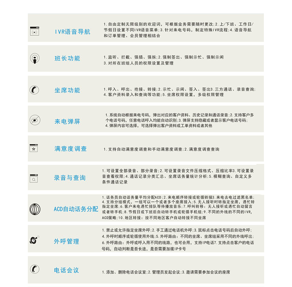1. 拫據座席業務要求進行業務控制和轉接,座席功能可針對業務管理需要實現單一功能、多功能、全功能、特殊功能、受限功能等;