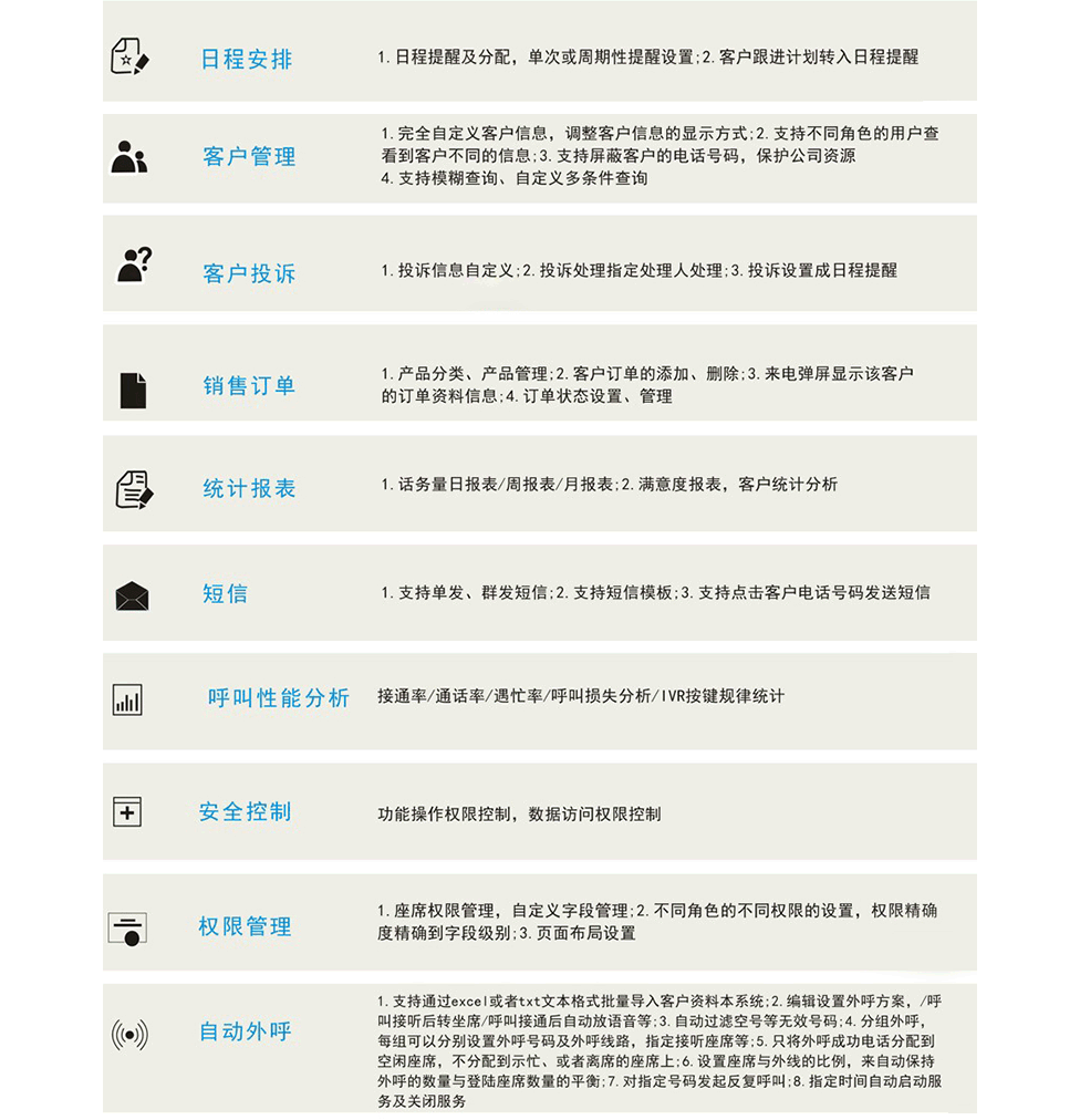 1. 具有來。去電彈屏. 鼠標撥號. 錄音. 客戶信息輸入. 分婁. 編組. 修改. 編輯. 導入導出