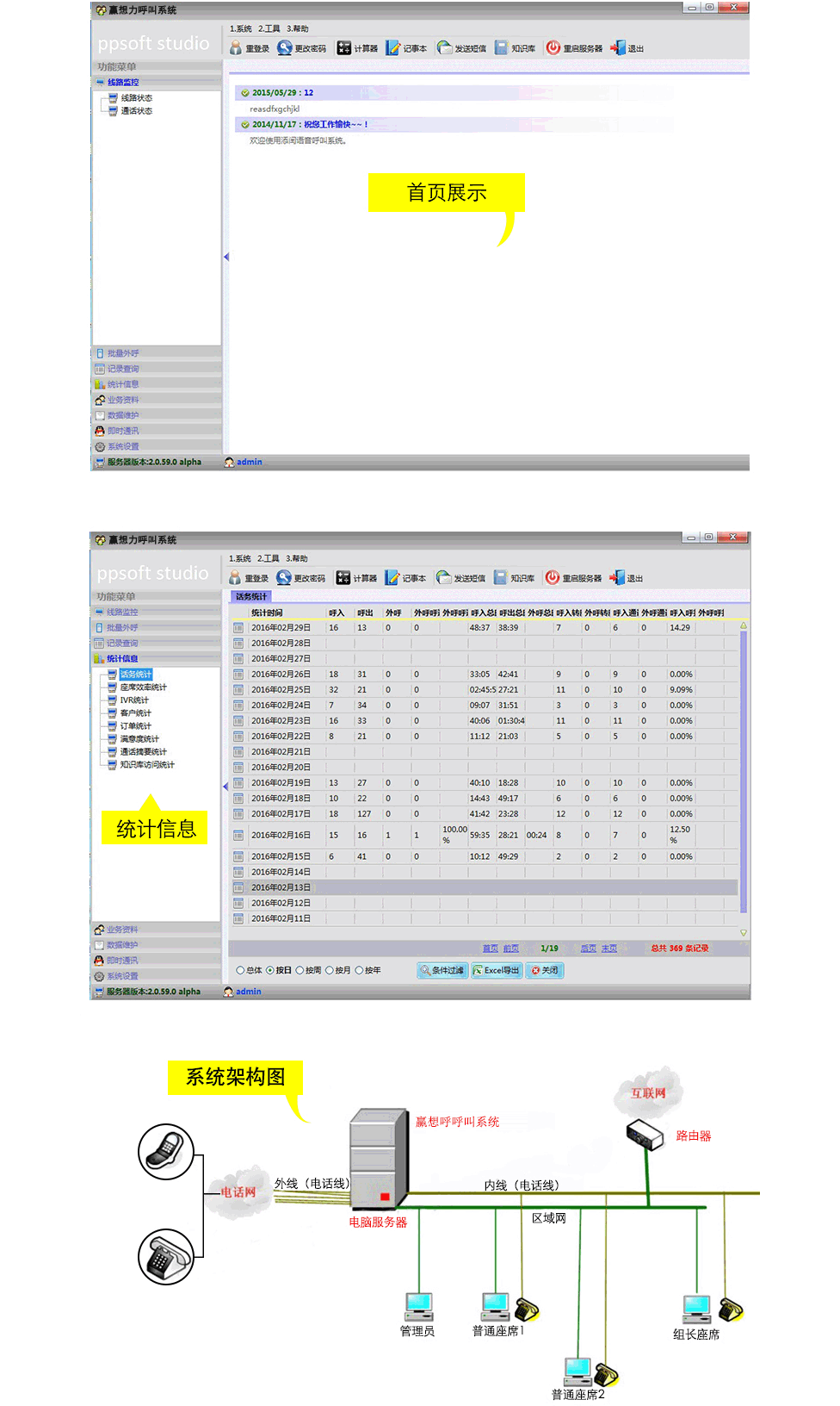 2. 強大的統計報表功能. 來. 去電次數. 通話時長可統計列表. 自動群呼時還能對已購. 有意向. 猶豫、占線. 未接、接聽后是否按鍵回呼等狀態分別列表出來. 便于針對不同客戸的特點采用回訪. 跟進. 勸說等不同