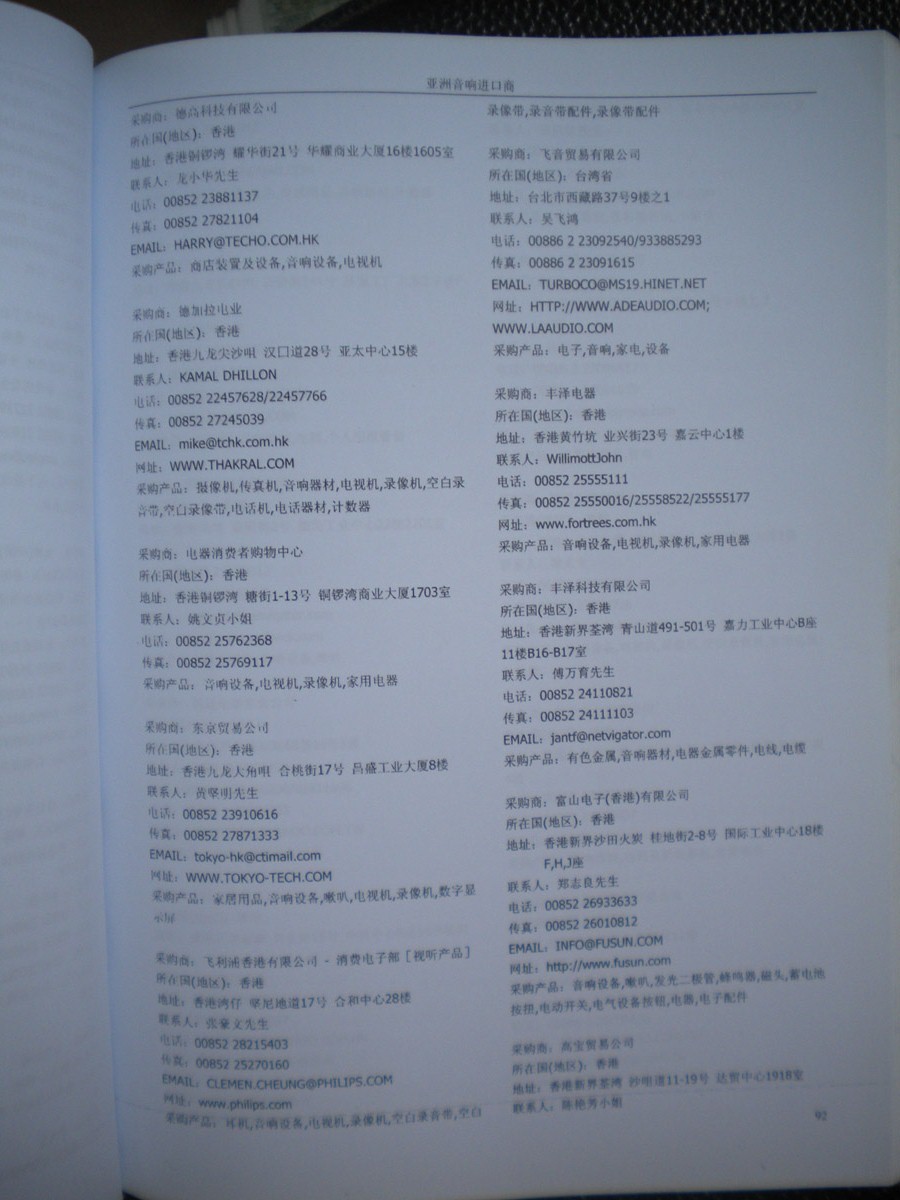 資料如何收集:在各大展會上,我們免費向到會采購商提供他們需要的最新產(chǎn)品雜志和光盤,我們也同時向他們派發(fā)帶有我們網(wǎng)站LOGO的精美禮品,這些最新的中國供應商的信息,對他們很有幫助,采購商會留下他們的名片,填寫詳細的產(chǎn)品求購信息,以期望得到更多的供應商的信息。收集到這些第一手的原始外商資料后,我們客戶服務中心立刻將名片掃描作成圖片,將產(chǎn)品采購信息做成數(shù)據(jù)庫,將采購商資料按行業(yè)不同,匯編成冊,出版發(fā)行《全球采購商黃頁》系列。