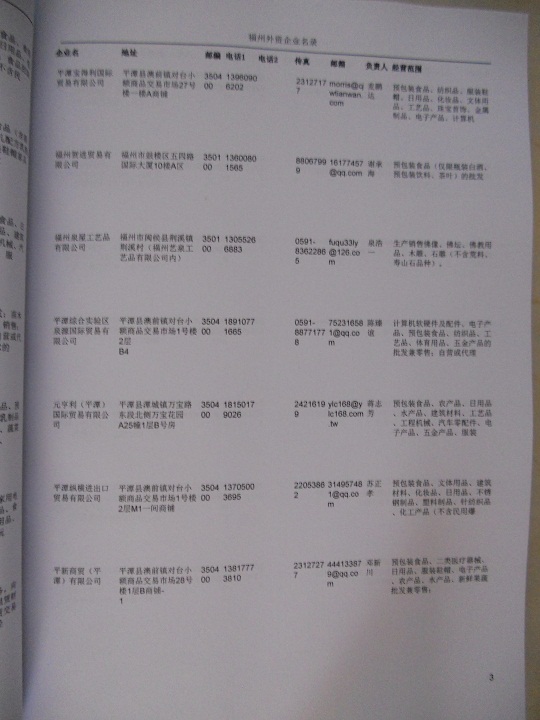 最新福州外資企業(yè)黃頁涵蓋了福州外商獨資企業(yè)、中外合資經(jīng)營企業(yè)以及港、澳、臺資企業(yè),包括福州臺資日資企業(yè)黃頁,福州外企黃頁具體內(nèi)容包括:企業(yè)名稱、地址、電話、傳真、郵箱、經(jīng)營范圍、注冊資金等信息;福州外資企業(yè)名單里面的企業(yè)都一些中外合資的大企業(yè),這些公司經(jīng)濟實力都比較雄厚,出口產(chǎn)品也比較多,業(yè)務范圍都比較廣,跟他們開展業(yè)務往來都比較容易;有了福州臺企日企黃頁開展業(yè)務也有了針對性,也省去了盲目去尋找客戶名單而浪費的時間了,工作效率也會有很大的提高.歡迎需要的客戶及時聯(lián)系我們!