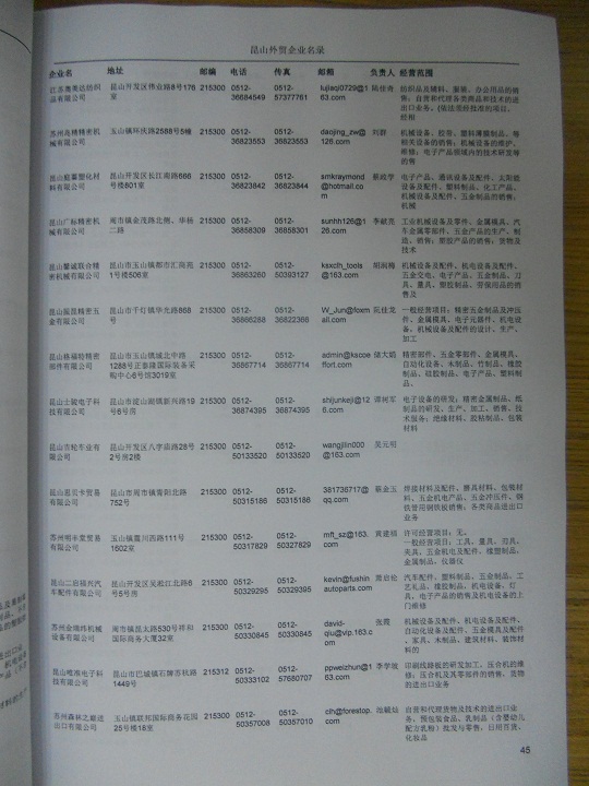 昆山外貿企業黃頁包括:外貿企業名稱、地址、電話、傳真、郵箱、經營范圍、注冊資金等信息。
