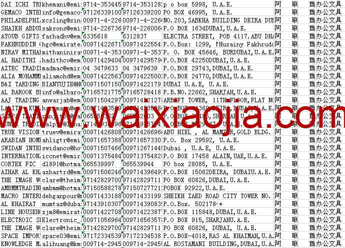 阿聯酋采購商黃頁包括:企業名稱、電子郵箱、聯系電話、傳真、聯系地址、聯系人、郵編等信息。
