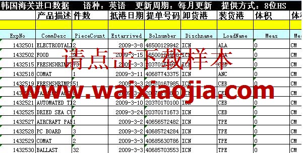 韓國海關進出口數據(KRCD)共有10個字段(10列,EXCEL格式),含韓國進口商(出口商)當月產品進口(出口)貿易額排序,及其聯系方式等
