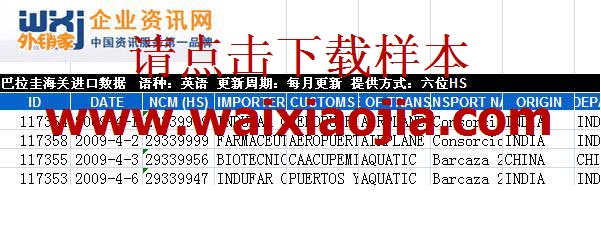 巴拉圭進口關單數據,以 巴拉圭 本土企業向全球 200 多個國家和地區進口各類商品的進口申報單證為依據。按照具體產品的精確 HS 編碼提供。數據內容包括:產品詳細描述、海關編碼描述、關單號、 日期、海關編碼、 進口商、進口商地址、電話、海關、運輸方式、運輸公司、原產國、采購國、數量、數量單位、 FOB 美元總價、 FOB 美元單價、 CIF 美元總價、 CIF 美元單價運費、千克凈重、毛重、出口商、運輸標志等詳細情報信息。
