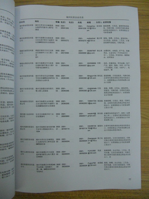 2021版最新福州企業黃頁包括《福州制造企業黃頁》、《福州貿易企業黃頁》、《福州民營企業黃頁》、《福州外資企業黃頁》、《福州外貿企業黃頁》共五冊,現優惠價:280元/冊。每冊內容包括:單位名稱、地址、郵編、電話、傳真、郵箱、經營范圍等;福州企業黃頁涵蓋了近幾年來最新成立的、有一定規模的企業,具有非常高的營銷價值。有了這套黃頁開展業務也有了針對性,也省去了盲目去尋找客戶名單而浪費的時間了,工作效率也會有很大的提高。歡迎需要福州企業黃頁的朋友及時聯系我們!