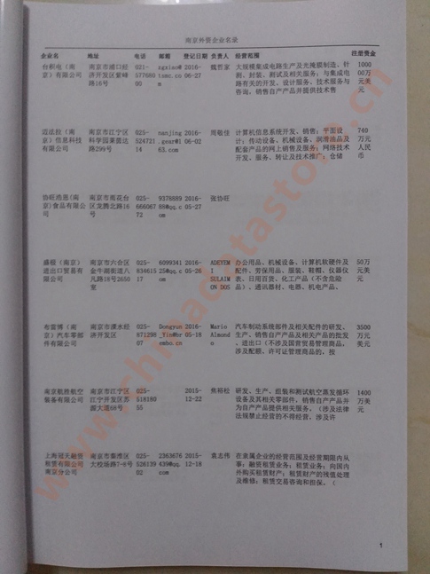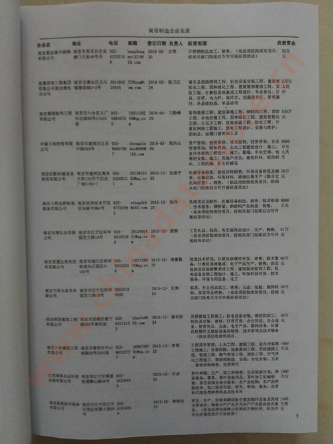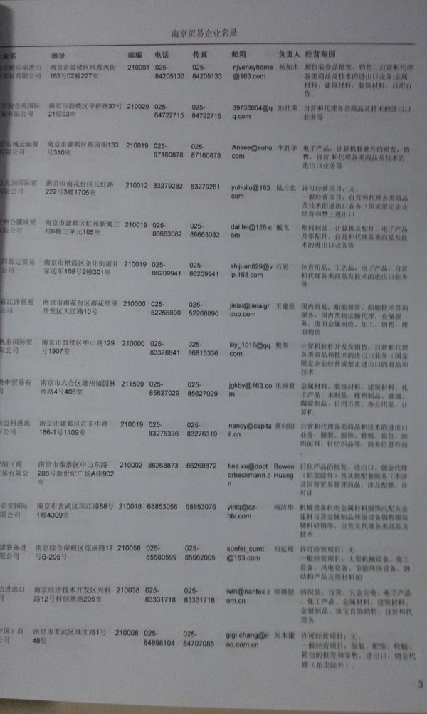 2021版最新南京企業黃頁包括《南京制造企業黃頁》、《南京貿易企業黃頁》、《南京民營企業黃頁》、《南京外資企業黃頁》、《南京外貿企業黃頁》共五冊,現優惠價:280元/冊。每冊內容包括:單位名稱、地址、郵編、電話、傳真、郵箱、經營范圍等;南京企業黃頁涵蓋了近幾年來最新成立的、有一定規模的企業,具有非常高的營銷價值。有了這套黃頁開展業務也有了針對性,也省去了盲目去尋找客戶名單而浪費的時間了,工作效率也會有很大的提高。歡迎需要南京企業黃頁的朋友及時聯系我們!