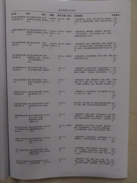 2021版最新金華企業黃頁包括《金華制造企業黃頁》、《金華貿易企業黃頁》、《金華民營企業黃頁》、《金華外資企業黃頁》、《金華外貿企業黃頁》共五冊,現優惠價:280元/冊。每冊內容包括:單位名稱、地址、郵編、電話、傳真、郵箱、經營范圍等;金華企業黃頁涵蓋了近幾年來最新成立的、有一定規模的企業,具有非常高的營銷價值。有了這套黃頁開展業務也有了針對性,也省去了盲目去尋找客戶名單而浪費的時間了,工作效率也會有很大的提高。歡迎需要金華企業黃頁的朋友及時聯系我們!