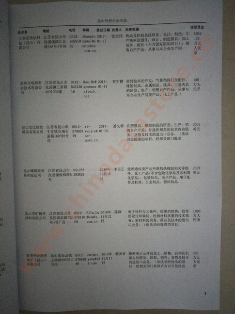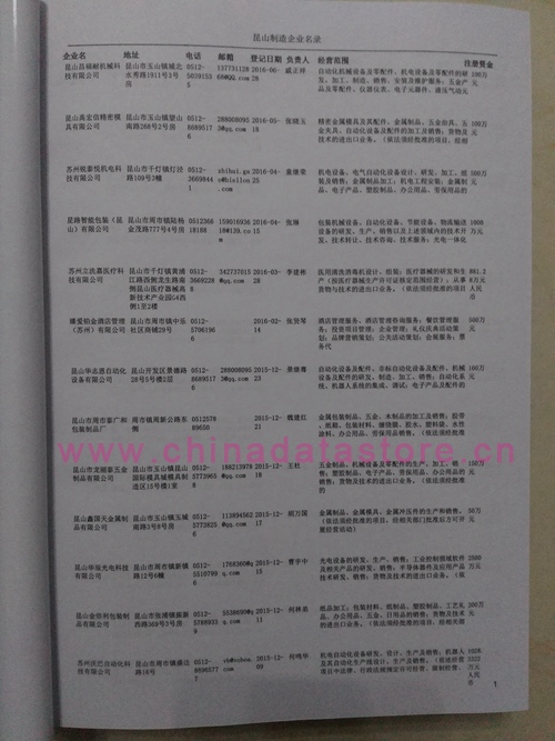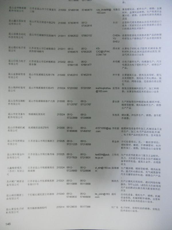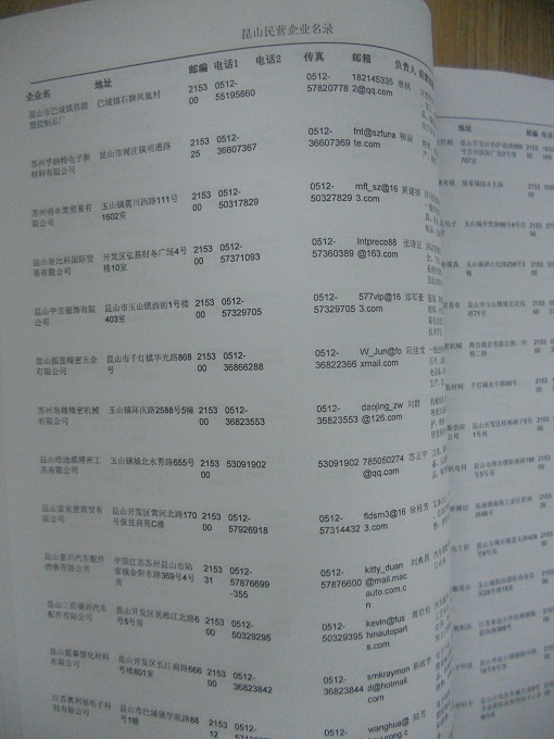 2021版最新昆山企業黃頁包括《昆山制造企業黃頁》、《昆山貿易企業黃頁》、《昆山民營企業黃頁》、《昆山外資企業黃頁》、《昆山外貿企業黃頁》共五冊,現優惠價:280元/冊。每冊內容包括:單位名稱、地址、郵編、電話、傳真、郵箱、經營范圍等;昆山企業黃頁涵蓋了近幾年來最新成立的、有一定規模的企業,具有非常高的營銷價值。有了這套黃頁開展業務也有了針對性,也省去了盲目去尋找客戶名單而浪費的時間了,工作效率也會有很大的提高。歡迎需要昆山企業黃頁的朋友及時聯系我們!