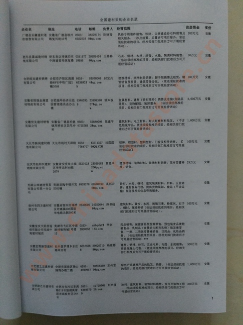 2025年新版中國建材采購企業黃頁,收錄了全國各地經營范圍涉及建材產品的貿易企業,這些都是頗具實力的建材產品的中國采購商。黃頁內容包含:企業名稱、地址、電話、傳真、郵箱、經營范圍、省份、注冊資金等信息。該套黃頁包含一個黃頁光碟加一冊紙質書刊,全國價格:1500元,省/直轄市價格:400元,城市價格:200元,共收錄了全國各地大概111371(統計日期:2018.1)家建材產品采購企業。黃頁光碟中是EXCEL格式,信息可任意修改、復制、打印、導出及導入到傳真、郵件群發等軟件中,無任何限制。