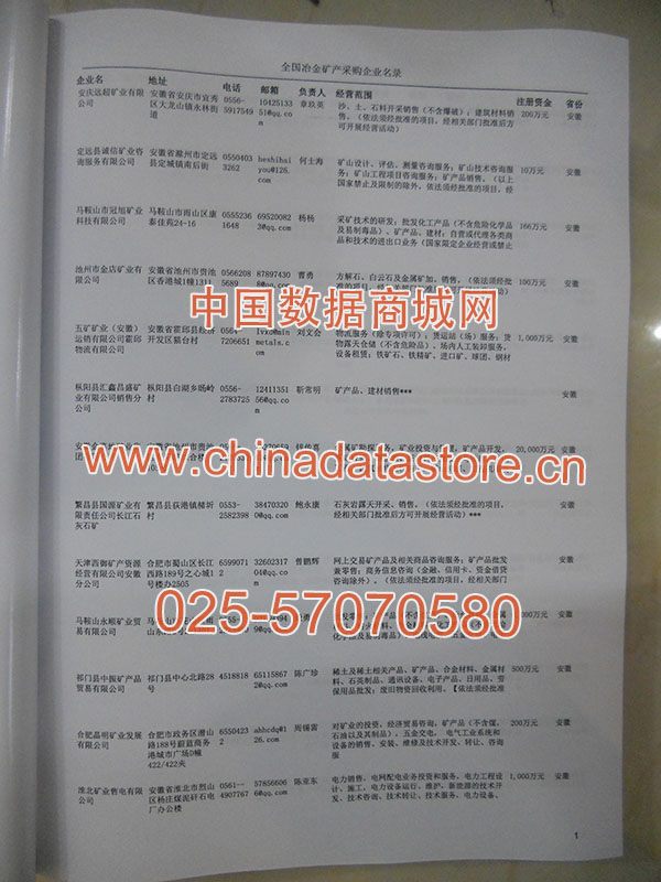 2025年新版中國冶金礦產采購企業黃頁,收錄了全國各地經營范圍涉及冶金礦產產品的貿易企業,這些都是頗具實力的冶金礦產產品的中國采購商。黃頁內容包含:企業名稱、地址、電話、傳真、郵箱、經營范圍、省份、注冊資金等信息。該套黃頁包含一個黃頁光碟加一冊紙質書刊,全國價格:1500元,省/直轄市價格:400元,城市價格:200元,共收錄了全國各地大概8042(統計日期:2018.1)家冶金礦產產品采購企業。黃頁光碟中是EXCEL格式,信息可任意修改、復制、打印、導出及導入到傳真、郵件群發等軟件中,無任何限制。