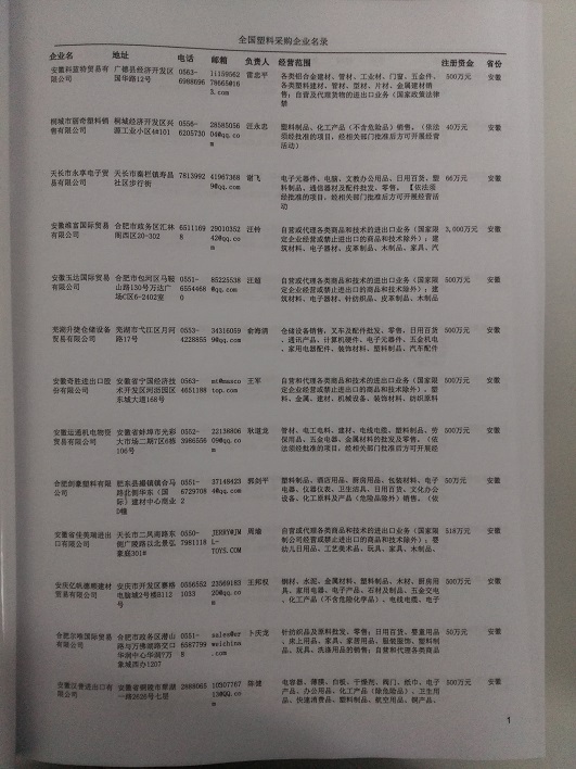 2025年新版中國塑料采購企業黃頁,收錄了全國各地經營范圍涉及塑料產品的貿易企業,這些都是頗具實力的塑料產品的中國采購商。黃頁內容包含:企業名稱、地址、電話、傳真、郵箱、經營范圍、省份、注冊資金等信息。該套黃頁包含一個黃頁光碟加一冊紙質書刊,全國價格:1500元元,省/直轄市價格:400元,城市價格:200元,共收錄了全國各地大概6700(統計日期:2018.1)家塑料產品采購企業。黃頁光碟中是EXCEL格式,信息可任意修改、復制、打印、導出及導入到傳真、郵件群發等軟件中,無任何限制。