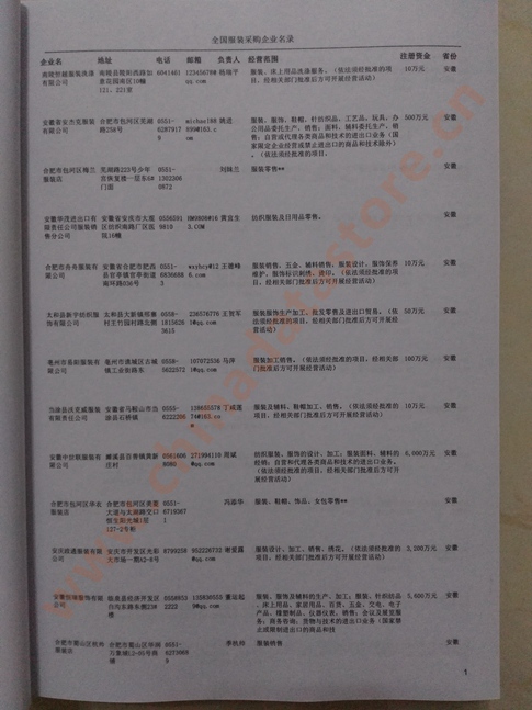 2025年新版中國服裝采購企業黃頁,收錄了全國各地經營范圍涉及服裝產品的貿易企業,這些都是頗具實力的服裝產品的中國采購商。黃頁內容包含:企業名稱、地址、電話、傳真、郵箱、經營范圍、省份、注冊資金等信息。該套黃頁包含一個黃頁光碟加一冊紙質書刊,全國的價格:1500元,省/直轄市價格:400元,城市價格:200元,共收錄了全國各地大概46646(統計日期:2018.1)服裝裝產品采購企業。黃頁光碟中是EXCEL格式,信息可任意修改、復制、打印、導出及導入到傳真、郵件群發等軟件中,無任何限制。