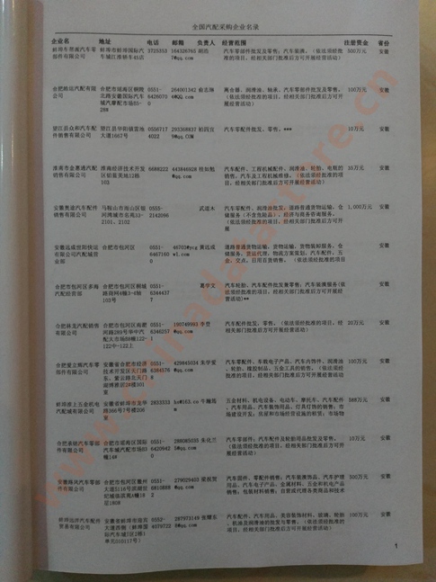 2025年新版中國(guó)汽配采購(gòu)企業(yè)黃頁(yè),收錄了全國(guó)各地經(jīng)營(yíng)范圍涉及汽配產(chǎn)品的貿(mào)易企業(yè),這些都是頗具實(shí)力的汽配產(chǎn)品的中國(guó)采購(gòu)商。黃頁(yè)內(nèi)容包含:企業(yè)名稱(chēng)、地址、電話、傳真、郵箱、經(jīng)營(yíng)范圍、省份、注冊(cè)資金等信息。該套黃頁(yè)包含一個(gè)黃頁(yè)光碟加一冊(cè)紙質(zhì)書(shū)刊,全國(guó)價(jià)格:1500元,省/直轄市價(jià)格:400元,城市價(jià)格:200元,共收錄了全國(guó)各地大概8952(統(tǒng)計(jì)日期:2018.1)家汽配產(chǎn)品采購(gòu)企業(yè)。黃頁(yè)光碟中是EXCEL格式,信息可任意修改、復(fù)制、打印、導(dǎo)出及導(dǎo)入到傳真、郵件群發(fā)等軟件中,無(wú)任何限制。
