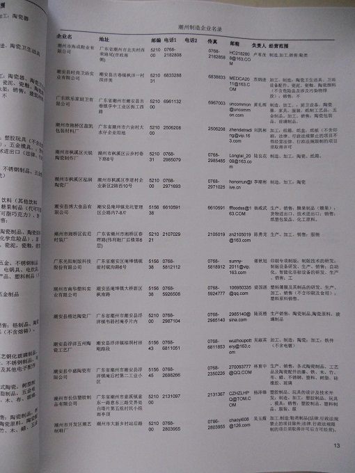 2021版最新潮州企業(yè)黃頁(yè)包括《潮州制造企業(yè)黃頁(yè)》、《潮州民營(yíng)企業(yè)黃頁(yè)》,現(xiàn)優(yōu)惠價(jià):280元/冊(cè)。每?jī)?cè)內(nèi)容包括:?jiǎn)挝幻Q(chēng)、地址、郵編、電話、傳真、郵箱、經(jīng)營(yíng)范圍等;潮州企業(yè)黃頁(yè)涵蓋了近幾年來(lái)最新成立的、有一定規(guī)模的企業(yè),具有非常高的營(yíng)銷(xiāo)價(jià)值。有了這套黃頁(yè)開(kāi)展業(yè)務(wù)也有了針對(duì)性,也省去了盲目去尋找客戶(hù)名單而浪費(fèi)的時(shí)間了,工作效率也會(huì)有很大的提高。歡迎需要潮州企業(yè)黃頁(yè)的朋友及時(shí)聯(lián)系我們!