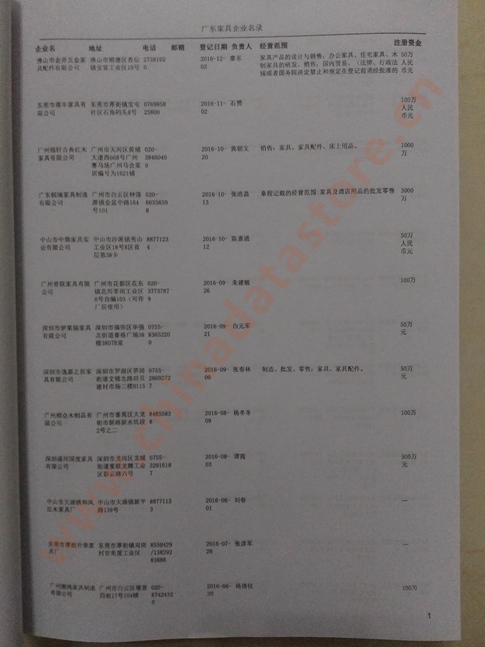 最新廣東家具生產(chǎn)與貿(mào)易企業(yè)黃頁數(shù)據(jù)更新日期2025年12月最新,全國(guó)廣東家具企業(yè)黃頁,都是具有一定規(guī)模的廣東家具行業(yè)的注冊(cè)實(shí)體企業(yè),數(shù)據(jù)準(zhǔn)確率高,是您開展各項(xiàng)營(yíng)銷活動(dòng)的必備資料。企業(yè)名單包括:企業(yè)名稱、地址、電話(以上必有,以下選有)、傳真、郵箱、登記日期、經(jīng)營(yíng)范圍、注冊(cè)資金等信息。廣東家具企業(yè)黃頁數(shù)據(jù)為Excel格式,信息可任意修改、復(fù)制、打印、導(dǎo)出及導(dǎo)入到傳真、郵件群發(fā)等軟件中,無任何限制。