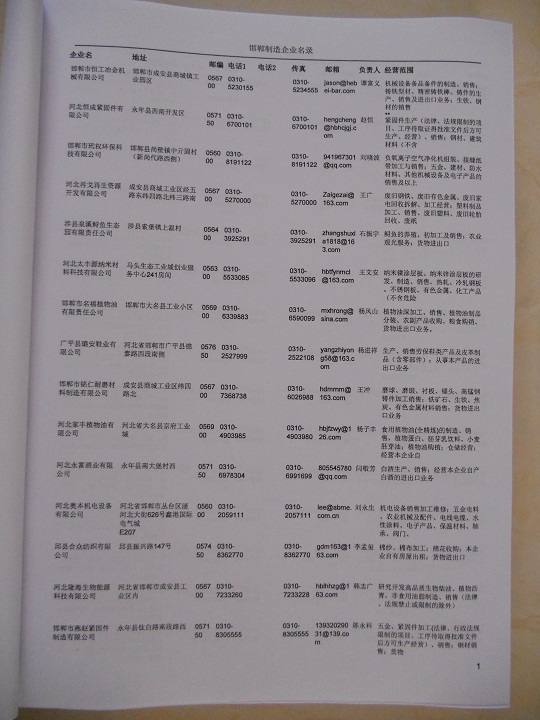 2021版最新邯鄲企業(yè)黃頁包括《邯鄲制造企業(yè)黃頁》、《邯鄲民營企業(yè)黃頁》,現(xiàn)優(yōu)惠價(jià):280元/冊。每冊內(nèi)容包括:單位名稱、地址、郵編、電話、傳真、郵箱、經(jīng)營范圍等;邯鄲企業(yè)黃頁涵蓋了近幾年來最新成立的、有一定規(guī)模的企業(yè),具有非常高的營銷價(jià)值。有了這套黃頁開展業(yè)務(wù)也有了針對(duì)性,也省去了盲目去尋找客戶名單而浪費(fèi)的時(shí)間了,工作效率也會(huì)有很大的提高。歡迎需要邯鄲企業(yè)黃頁的朋友及時(shí)聯(lián)系我們!