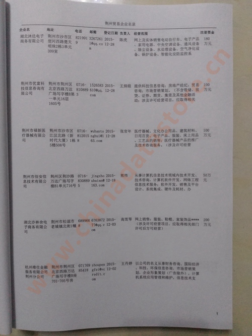 2021版最新荊州企業黃頁包括《荊州制造企業黃頁》、《荊州民營企業黃頁》,現優惠價:280元/冊。每冊內容包括:單位名稱、地址、郵編、電話、傳真、郵箱、經營范圍等;荊州企業黃頁涵蓋了近幾年來最新成立的、有一定規模的企業,具有非常高的營銷價值。有了這套黃頁開展業務也有了針對性,也省去了盲目去尋找客戶名單而浪費的時間了,工作效率也會有很大的提高。歡迎需要荊州企業黃頁的朋友及時聯系我們!
