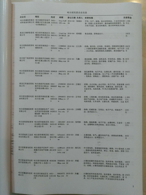 2021版最新哈爾濱企業黃頁包括《哈爾濱制造企業黃頁》、《哈爾濱民營企業黃頁》,現優惠價:280元/冊。每冊內容包括:單位名稱、地址、郵編、電話、傳真、郵箱、經營范圍等;哈爾濱企業黃頁涵蓋了近幾年來最新成立的、有一定規模的企業,具有非常高的營銷價值。有了這套黃頁開展業務也有了針對性,也省去了盲目去尋找客戶名單而浪費的時間了,工作效率也會有很大的提高。歡迎需要哈爾濱企業黃頁的朋友及時聯系我們!