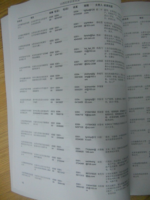 2021版最新山西企業(yè)黃頁包括《山西制造企業(yè)黃頁》、《山西貿易企業(yè)黃頁》、《山西民營企業(yè)黃頁》共三冊,優(yōu)惠價:280元/冊。每冊內容包括:單位名稱、地址、郵編、電話、傳真、郵箱、經營范圍等;山西企業(yè)黃頁涵蓋了近幾年來最新成立的、有一定規(guī)模的企業(yè),具有非常高的營銷價值。有了這套黃頁開展業(yè)務也有了針對性,也省去了盲目去尋找客戶名單而浪費的時間了,工作效率也會有很大的提高。歡迎需要山西企業(yè)黃頁的朋友及時聯(lián)系我們!