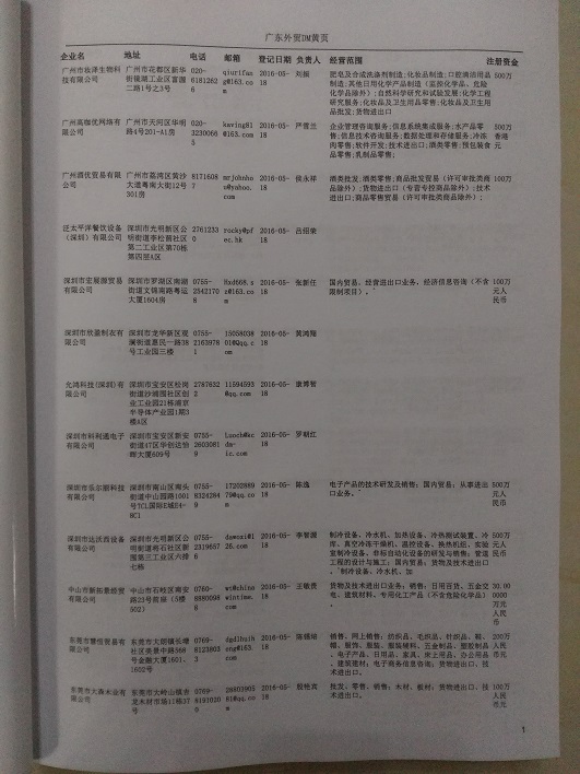 廣東外貿企業黃頁包括:外貿企業名稱、地址、電話、傳真、郵箱、經營范圍、注冊資金等信息。