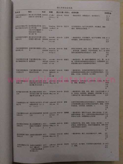 浙江外貿企業黃頁包括:外貿企業名稱、地址、電話、傳真、郵箱、經營范圍、注冊資金等信息。