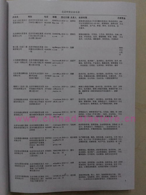 北京外貿企業黃頁包括:外貿企業名稱、地址、電話、傳真、郵箱、經營范圍、注冊資金等信息。