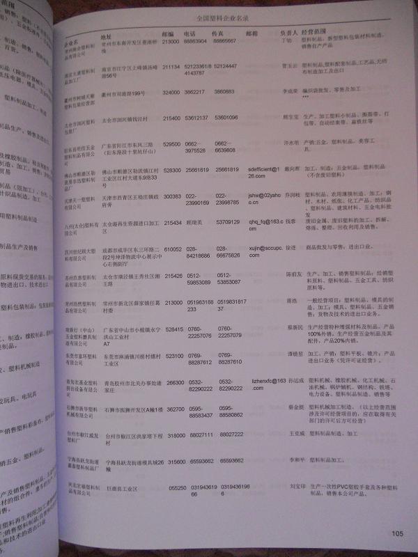 塑料制品外貿(mào)企業(yè)黃頁包括:外貿(mào)企業(yè)名稱、地址、電話、傳真、郵箱、經(jīng)營(yíng)范圍、注冊(cè)資金等信息。