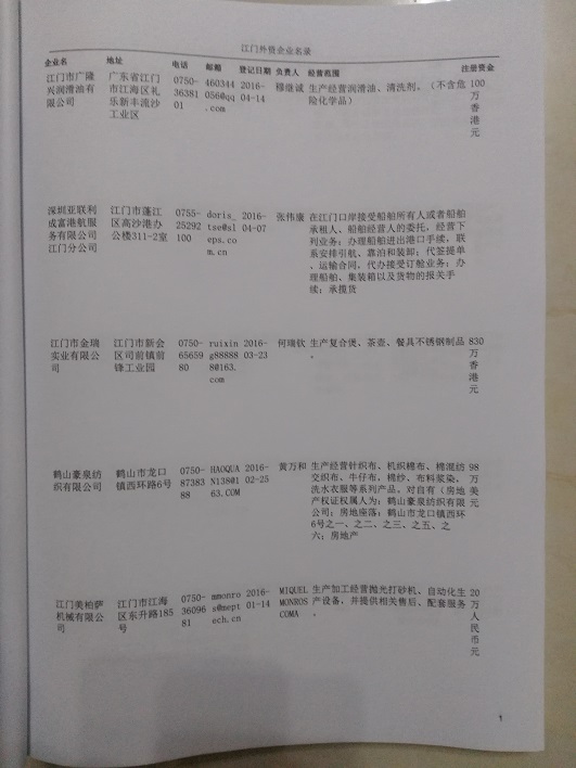 江門外貿企業黃頁包括:外貿企業名稱、地址、電話、傳真、郵箱、經營范圍、注冊資金等信息。