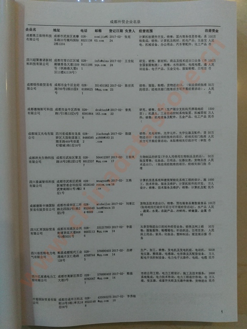 成都外貿企業(yè)黃頁包括:外貿企業(yè)名稱、地址、電話、傳真、郵箱、經營范圍、注冊資金等信息。
