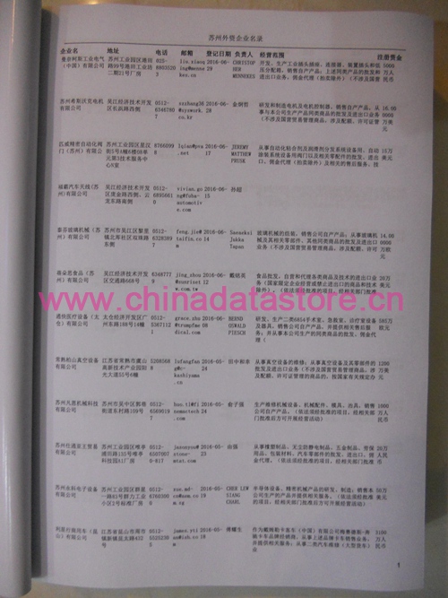 最新蘇州外資企業黃頁涵蓋了蘇州外商獨資企業、中外合資經營企業以及港、澳、臺資企業,包括蘇州臺資日資企業黃頁,蘇州外企黃頁黃頁具體內容包括:企業名稱、地址、電話、傳真、郵箱、經營范圍、注冊資金等信息;蘇州臺企日企名單里面的企業都一些中外合資的大企業,這些公司經濟實力都比較雄厚,出口產品也比較多,業務范圍都比較廣,跟他們開展業務往來都比較容易;有了蘇州外企黃頁開展業務也有了針對性,也省去了盲目去尋找客戶名單而浪費的時間了,工作效率也會有很大的提高.歡迎需要的客戶及時聯系我們!