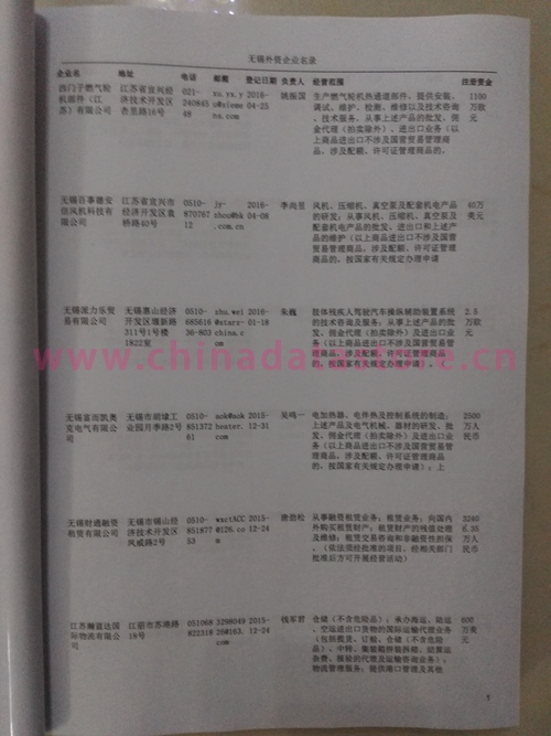 最新無錫外資企業黃頁涵蓋了無錫外商獨資企業、中外合資經營企業以及港、澳、臺資企業,包括無錫臺資日資企業黃頁,無錫外企黃頁具體內容包括:企業名稱、地址、電話、傳真、郵箱、經營范圍、注冊資金等信息;無錫臺企日企黃頁里面的企業都一些中外合資的大企業,這些公司經濟實力都比較雄厚,出口產品也比較多,業務范圍都比較廣,跟他們開展業務往來都比較容易;有了無錫外資企業黃頁開展業務也有了針對性,也省去了盲目去尋找客戶名單而浪費的時間了,工作效率也會有很大的提高.歡迎需要的客戶及時聯系我們!