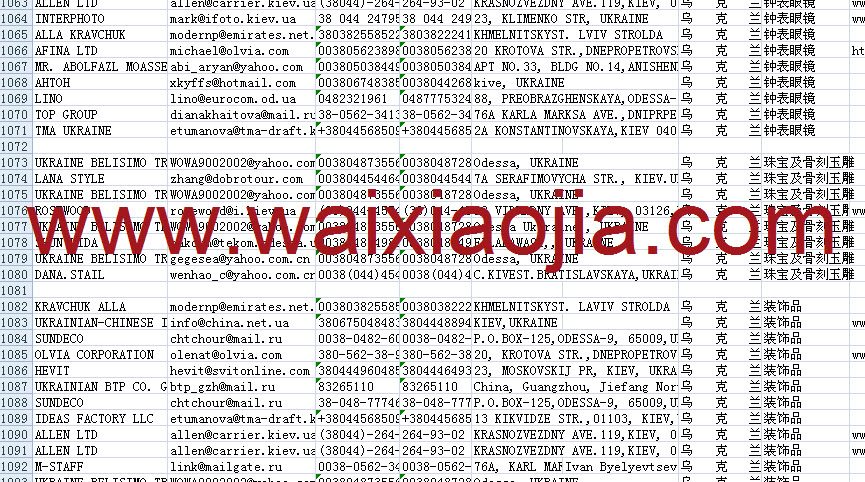 烏克蘭采購商名單數(shù)據(jù)為Excel格式,信息可任意修改、復(fù)制、打印、導(dǎo)出及導(dǎo)入到傳真、郵件群發(fā)等軟件中,無任何限制。